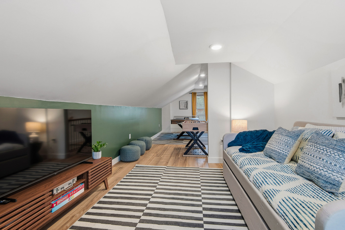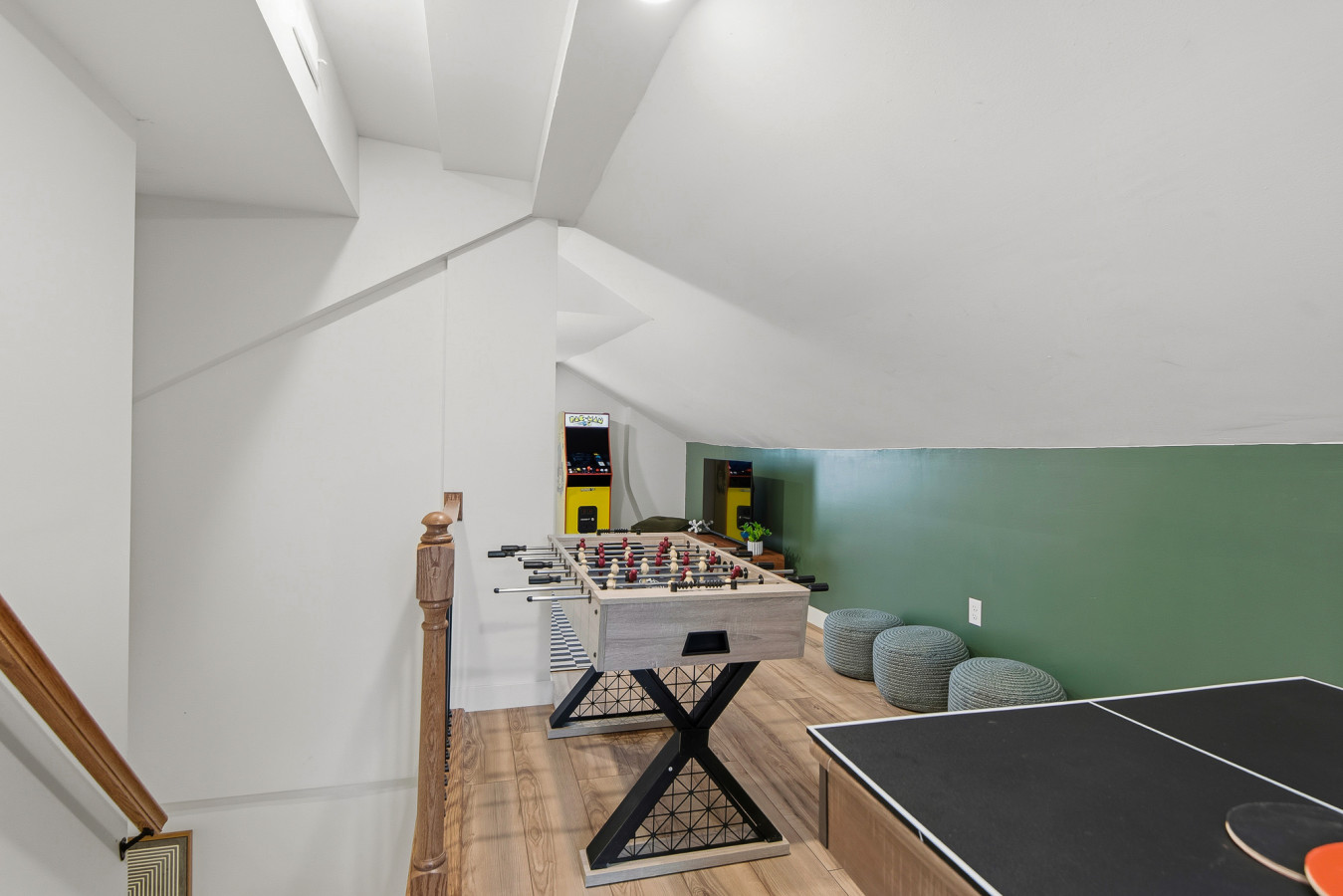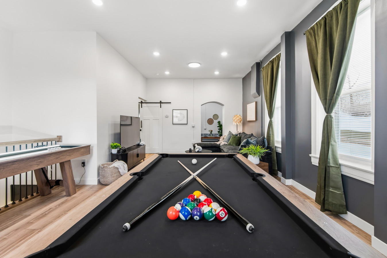 The top-floor Game Room offers Pool, Ping Pong, Shuffleboard, and PacMan—ideal for group fun. Perfect for reunions and family getaways, featuring a covered BBQ patio, full kids playset, and unique touches like the Harry Potter Closet.