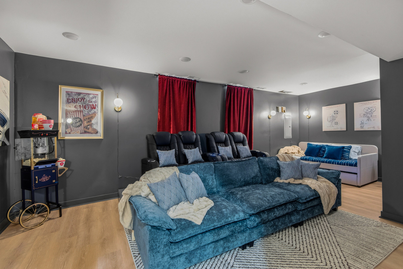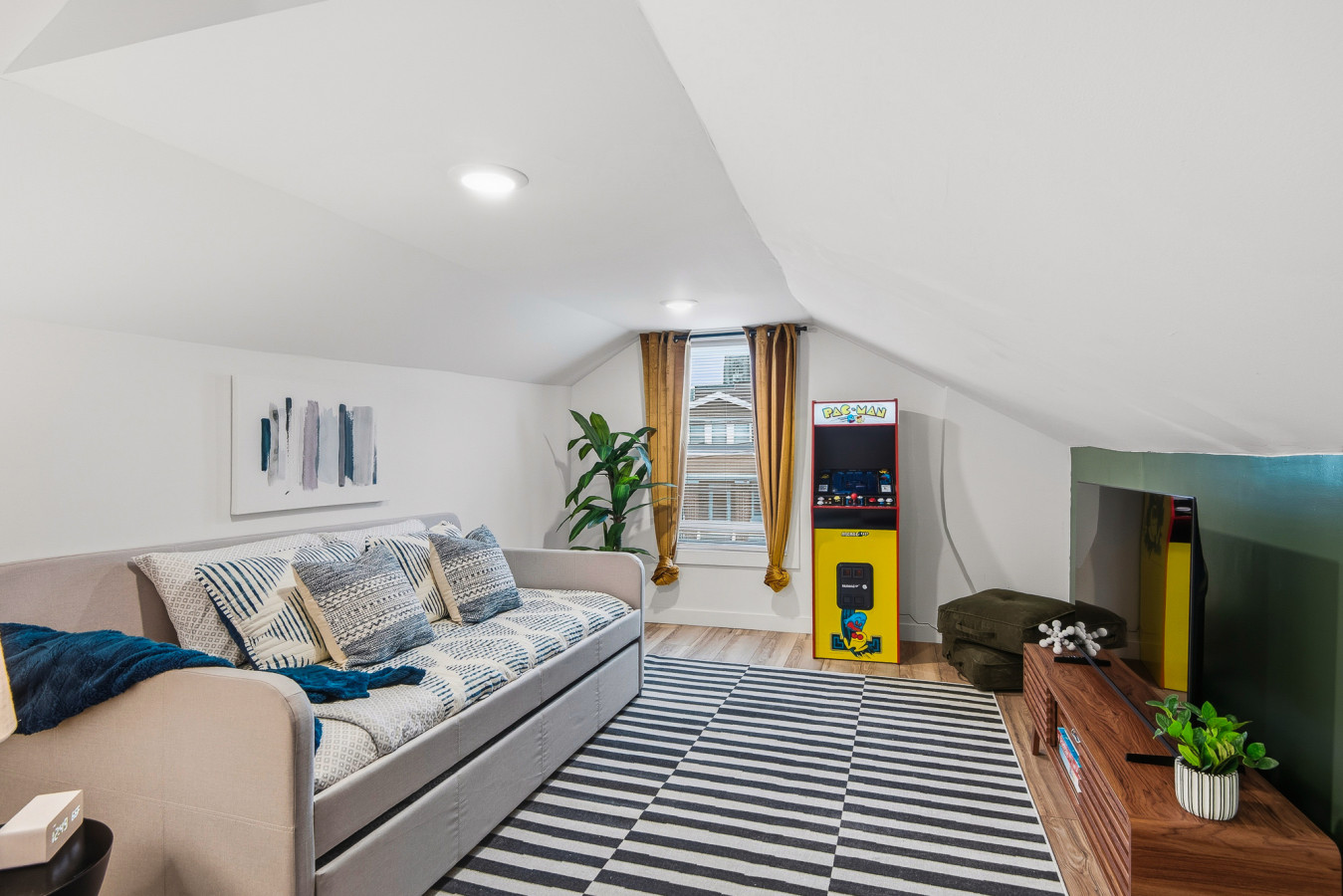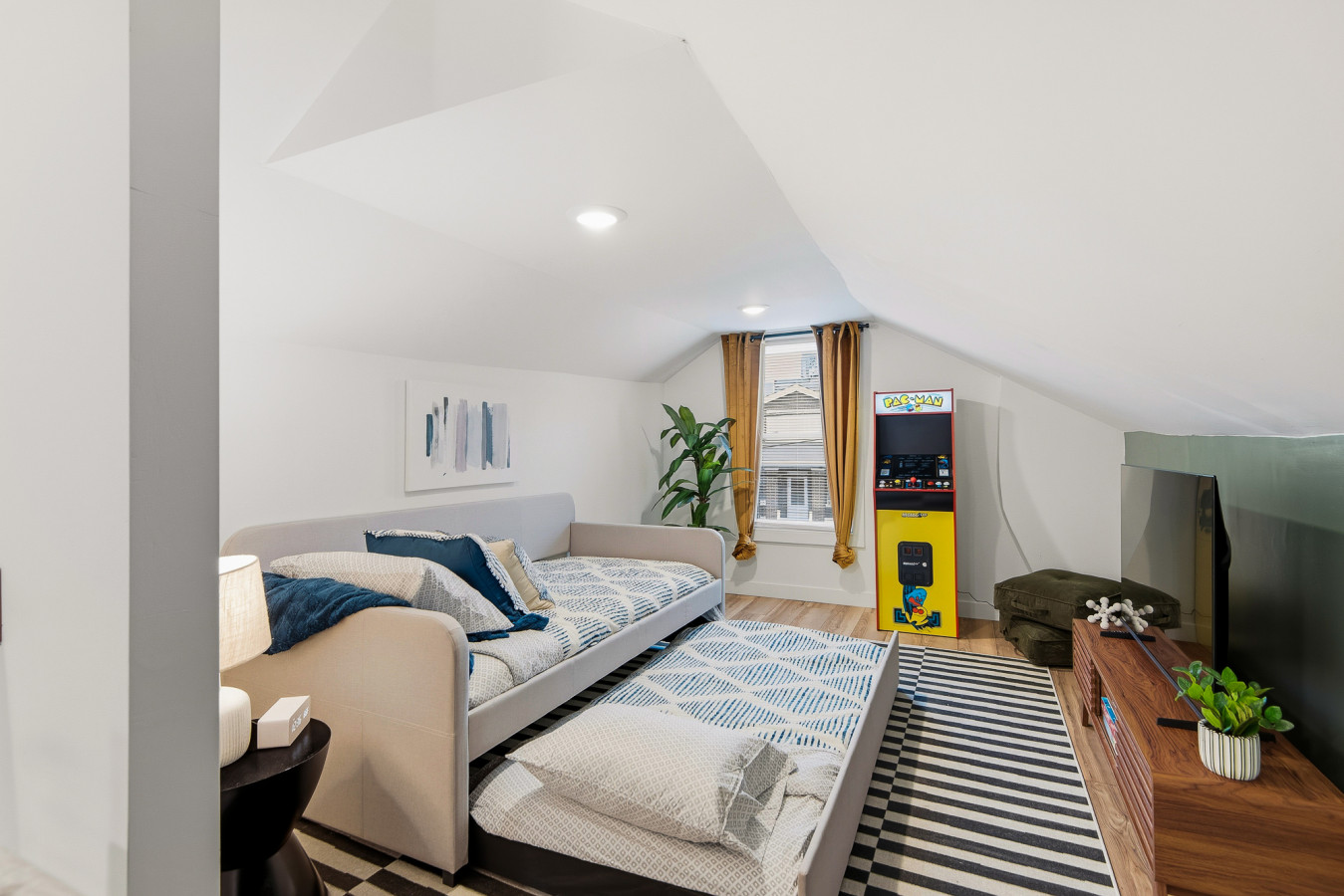 The top-floor Game Room offers Pool, Ping Pong, Shuffleboard, and PacMan—ideal for group fun. Perfect for reunions and family getaways, featuring a covered BBQ patio, full kids playset, and unique touches like the Harry Potter Closet.