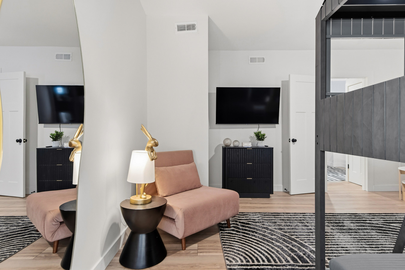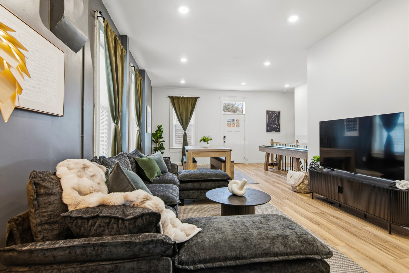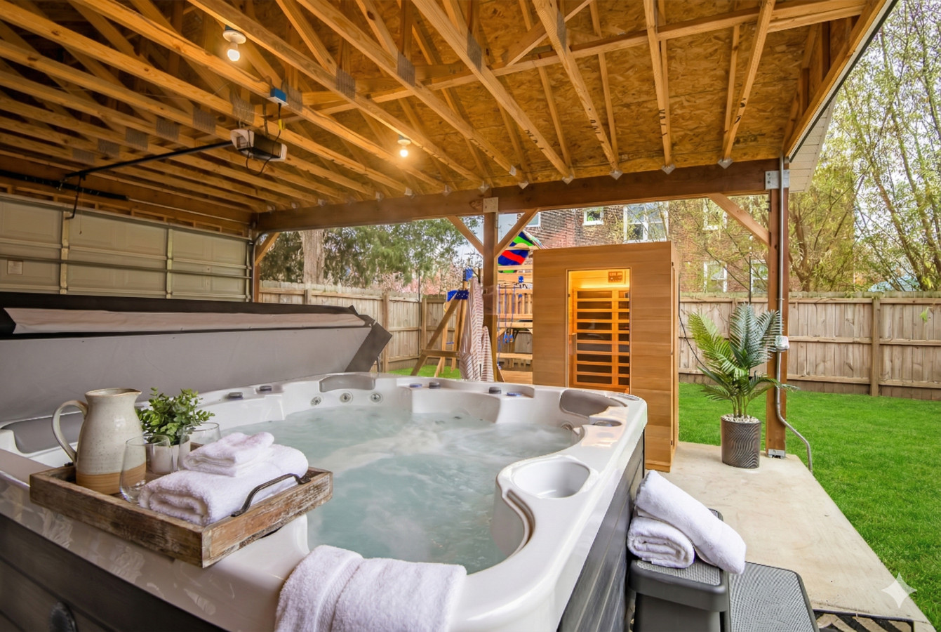 This modern, 5-bedroom STL Oasis is designed for maximum entertainment and relaxation, hosting up to 19 guests. Enjoy a private Sauna, Hot Tub, and Firepit Lounge.